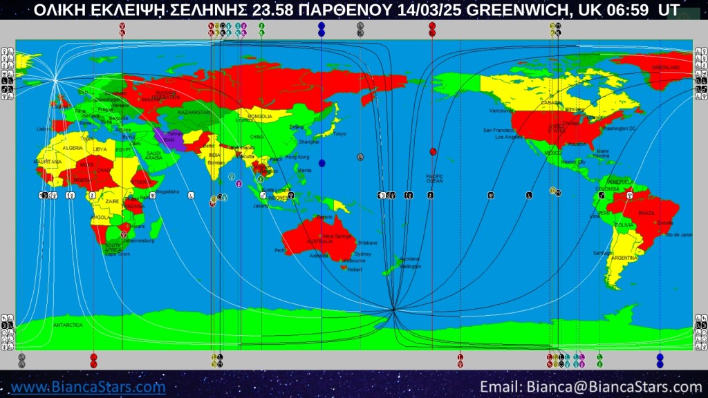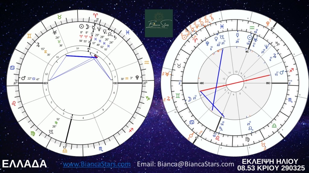 Δύο σημαντικές εκλείψεις: η πρώτη στις 14 Μαρτίου συνδέεται με την έκλειψη της 17ης Σεπτεμβρίου 2024, και η δεύτερη στις 29 Μαρτίου κλείνει τον κύκλο των εκλείψεων στον άξονα Κριού-Ζυγού, συνδεόμενη με εκλείψεις του 2023 και της 2ης Οκτωβρίου 2024.