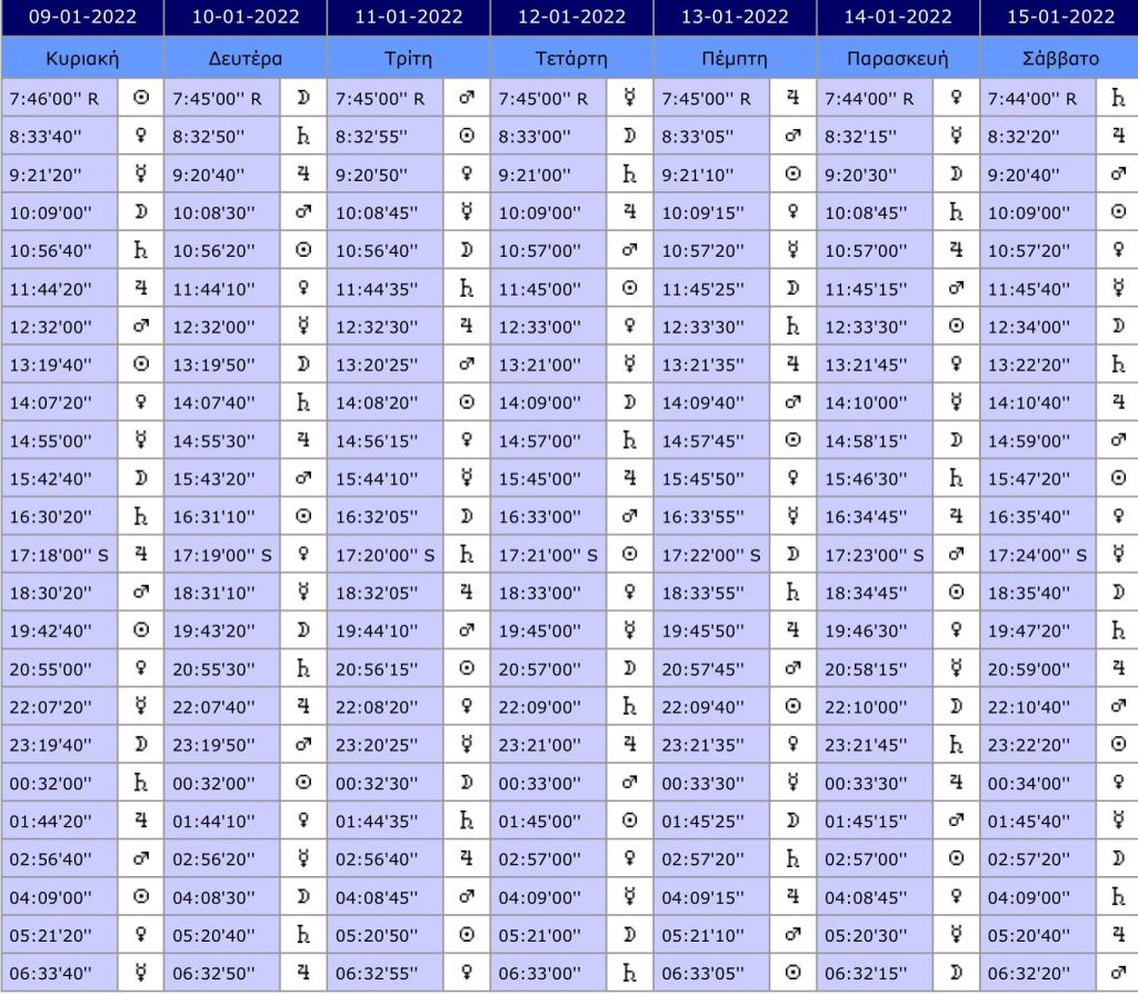 Στον πίνακα που ακολουθεί δίνεται ο Πίνακας των Πλανητικών Ωρών για κάθε μέρα της Εβδομάδας. Στην Ώρα της Ανατολής Ηλίου υπάρχει δίπλα ακριβώς το (R) ενώ στην Ώρα της Δύσης του Ήλιου υπάρχει δίπλα ακριβώς το (S) ως σύμβολα της Ανατολής και Δύσης του Ήλιου.